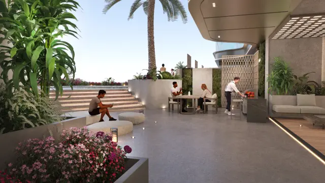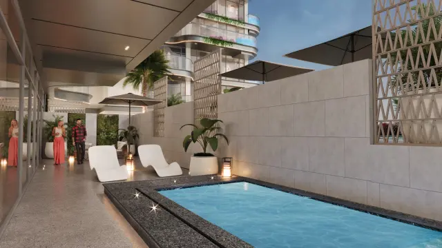 A curated selection of amenities enriches the lifestyle experience, including an infinity rooftop saltwater pool with sea and harbor views, a podium-level saltwater pool, indoor and outdoor lounges, a business lounge with espresso bar, cinema hall, gym with Technogym equipment, game room, kids’ area, rooftop sundeck with jacuzzi, yoga and meditation spaces, BBQ areas, and 24-hour concierge service. These settings are designed to merge wellness, leisure, and elevated social living in an atmosphere of island tranquility.