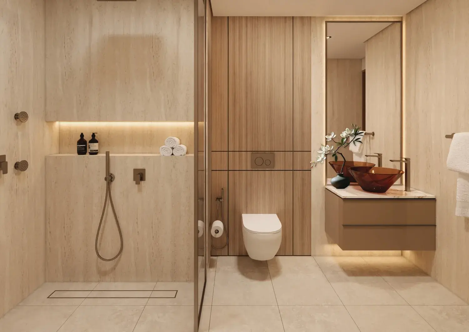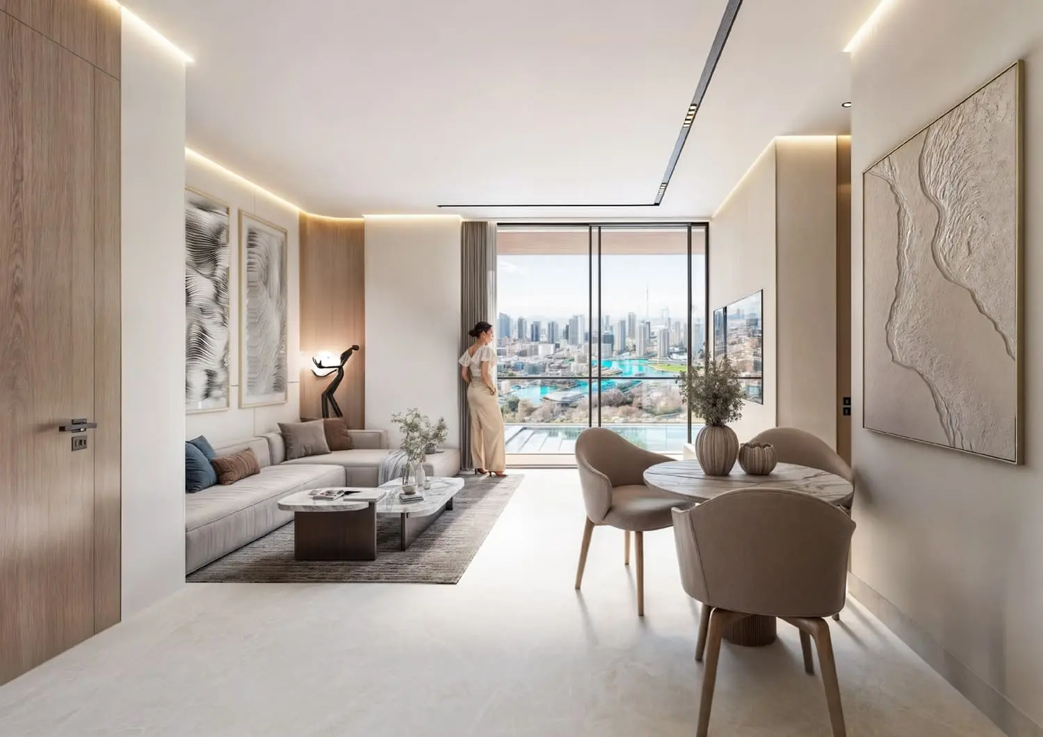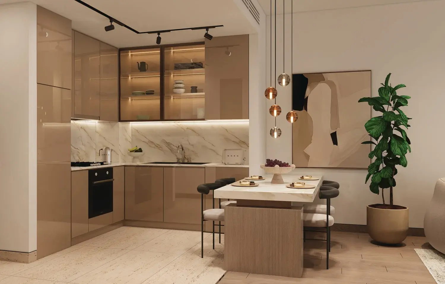Interiors are finished with modern, high-quality materials and equipped with a smart home system. Kitchens feature Italian-designed cabinetry and are fully fitted with built-in appliances, combining functionality with refined aesthetics. Residences are delivered semi-furnished and include fully fitted dressing rooms with Italian design elements, glass doors, and integrated internal lighting, ensuring a polished and comfortable living environment.
